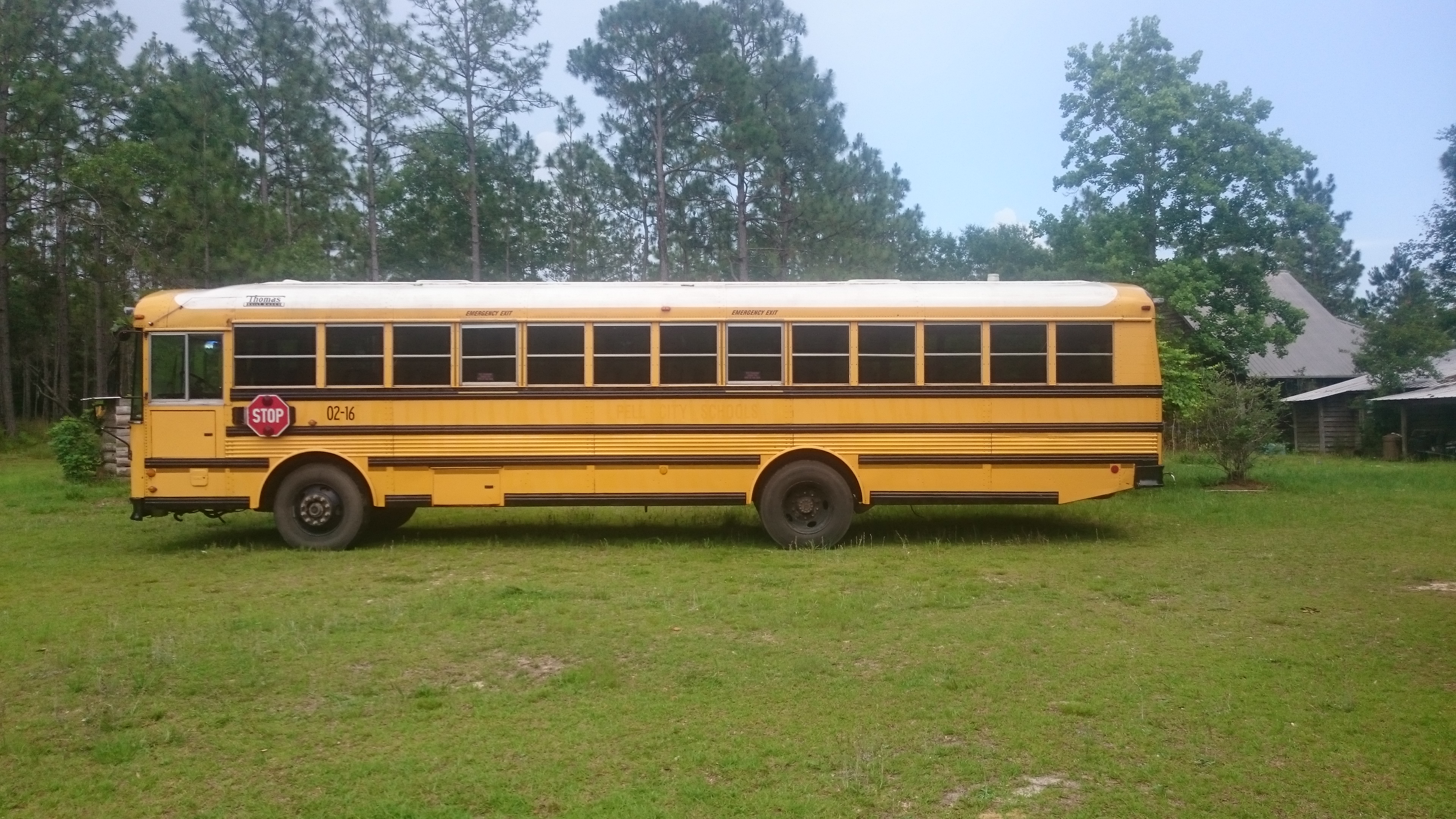 It is a 2001 model Thomas Saf-T Liner with 126,600 miles, relatively new tires and brakes, very little rust and surprisingly good paint. This is a 78 passenger model, so it is quite large- approximately 38 feet long, 8 feet wide, and somewhere over 9 feet tall. It is powered by a 5.9 liter Cummins turbo diesel and an Allison 2000 series 5 speed automatic transmission and rolls on semi truck-sized 11R22.5 tires.