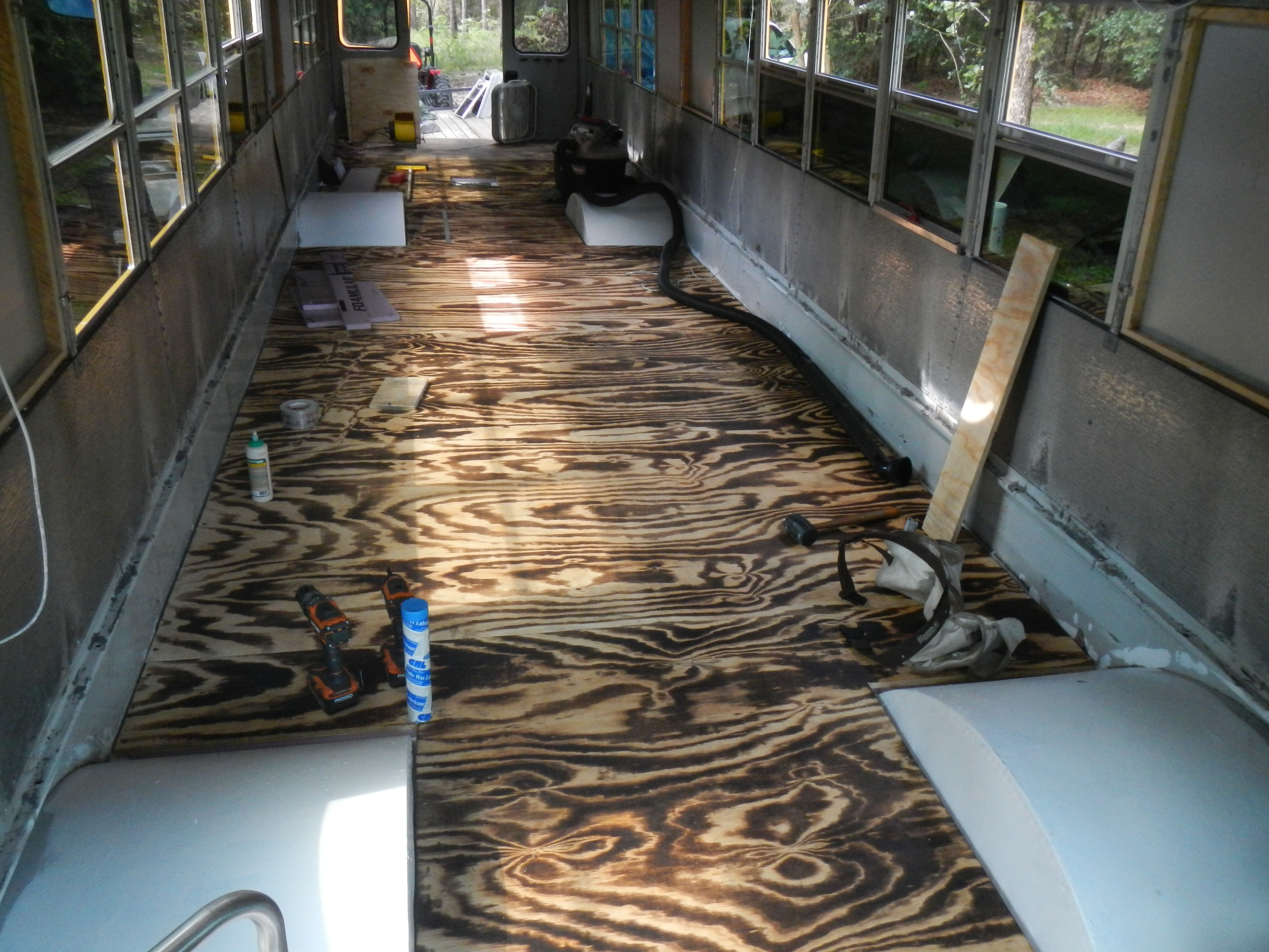 As I write this, the bus is sealed up with a dehumidifier inside to drop the RH to approximately 55% in preparation for sanding and the first coat of oil. I’ll finish the darkest wood first thing tomorrow and then I’ll consult with Hannah to see if its advisable to do a second pass on the installed wood or leave it as is. After that, its time to put ceiling panels back in and begin framing the interior!