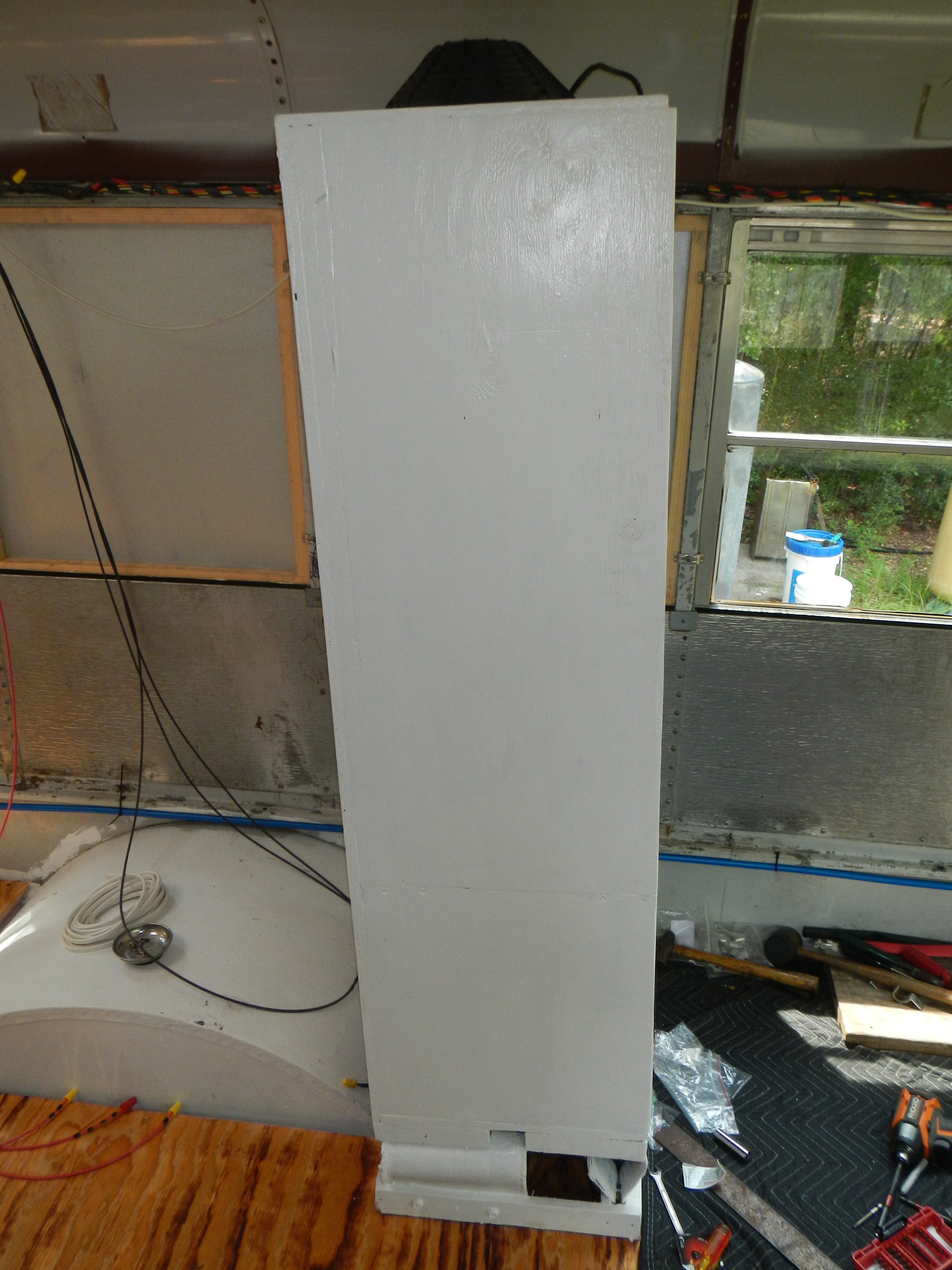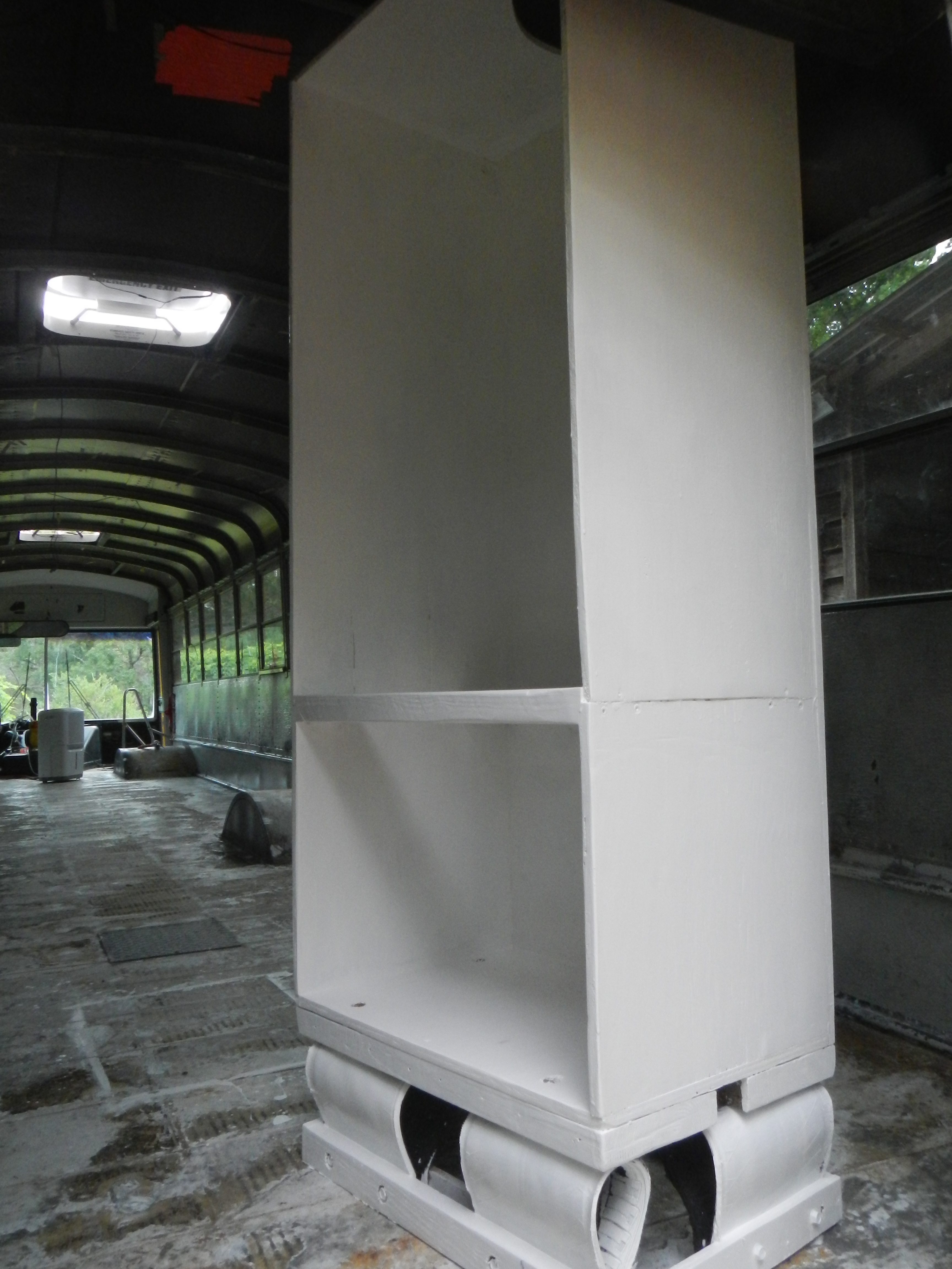When the last coat of wax was buffed, Bob and Karyn helped me move the enclosure into place, after which I bolted the base to the frame of the bus (the only case so far where I have drilled through the plywood, insulation and bus floor to run bolts) and began installing hardware.