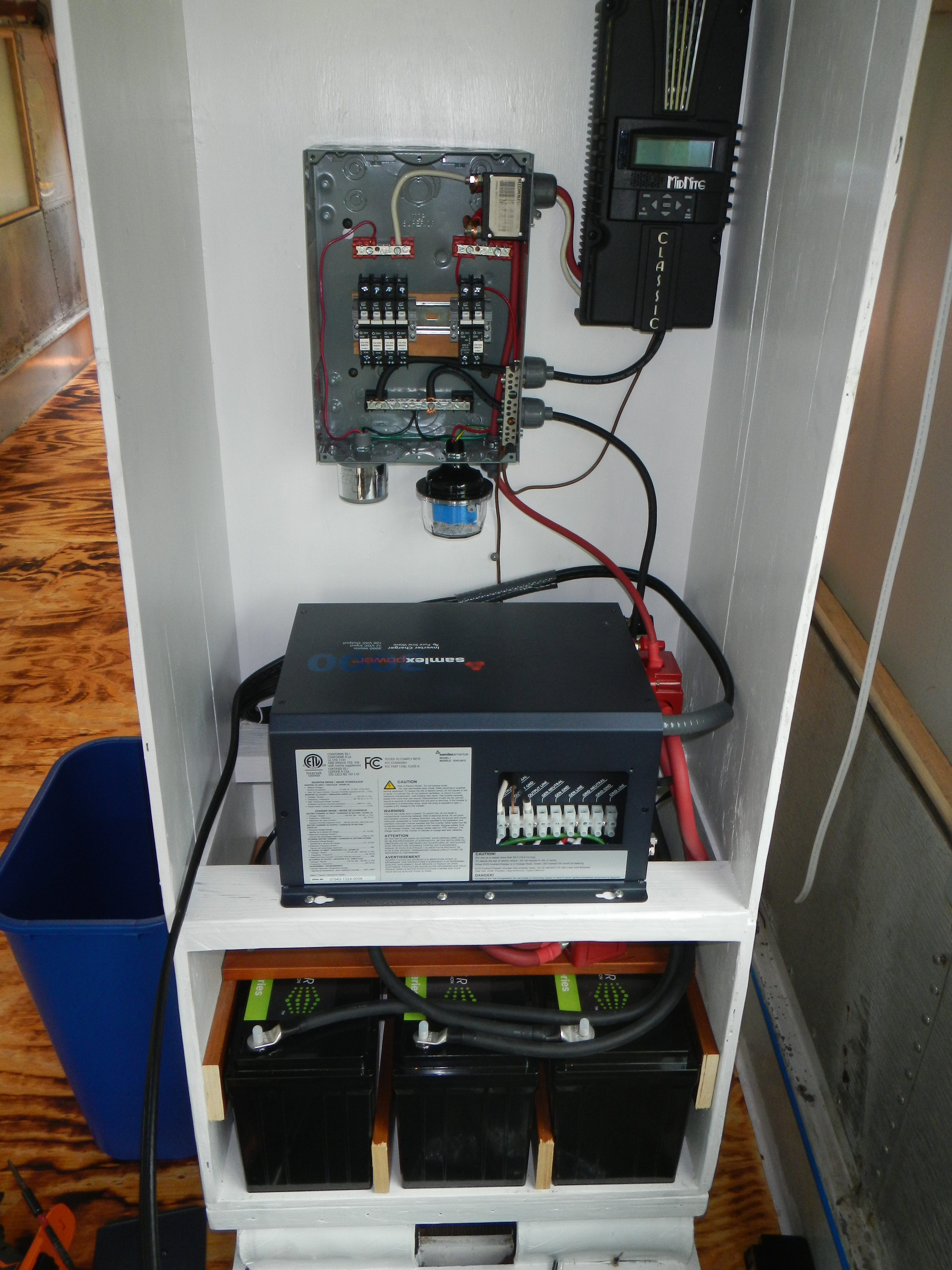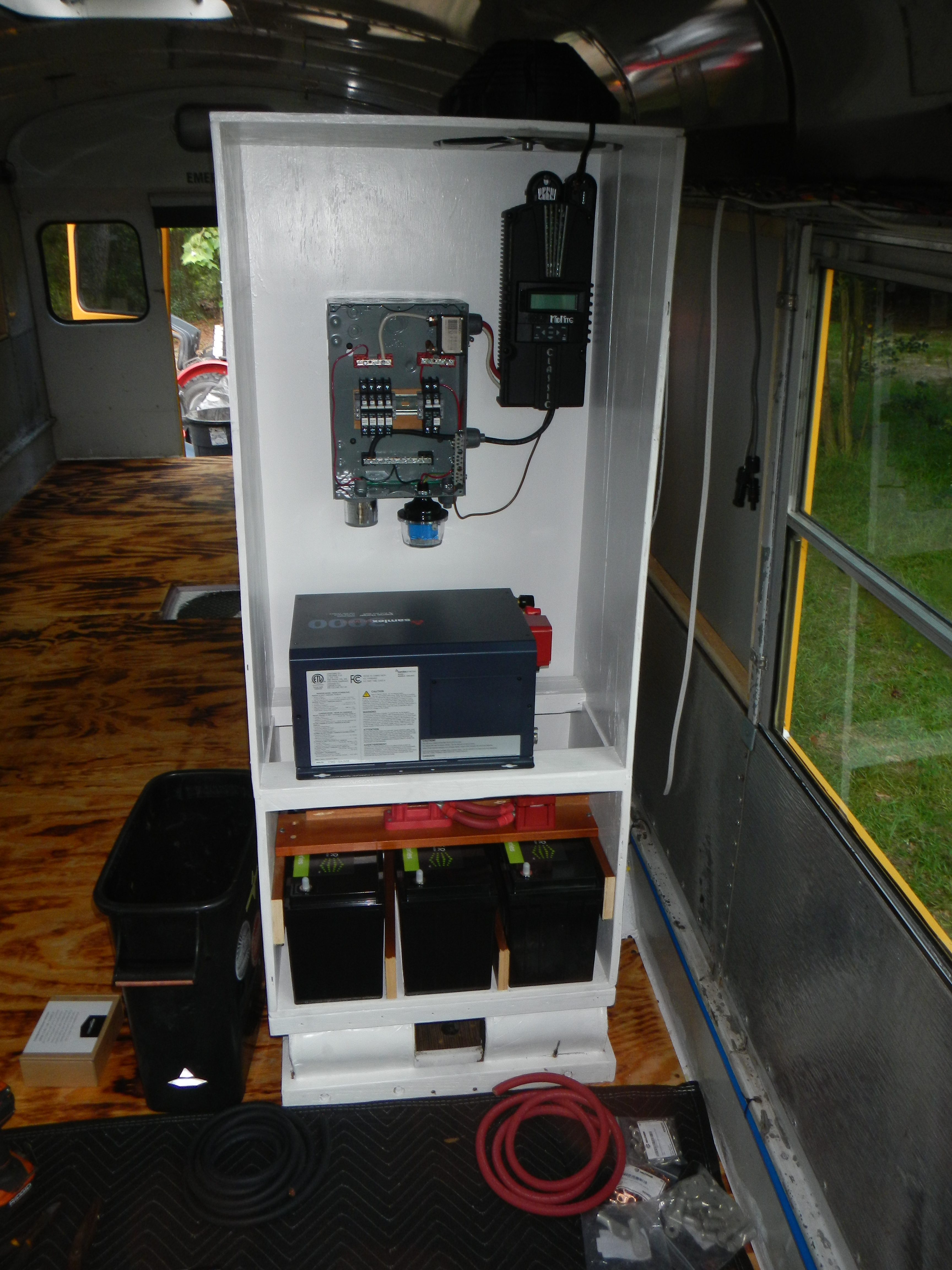After mounting the charge controller and breaker box, I found that adding anything else would make the enclosure too heavy to easily move into the bus when the time came, so it sat on the porch for a month while I worked on the bus interior.
