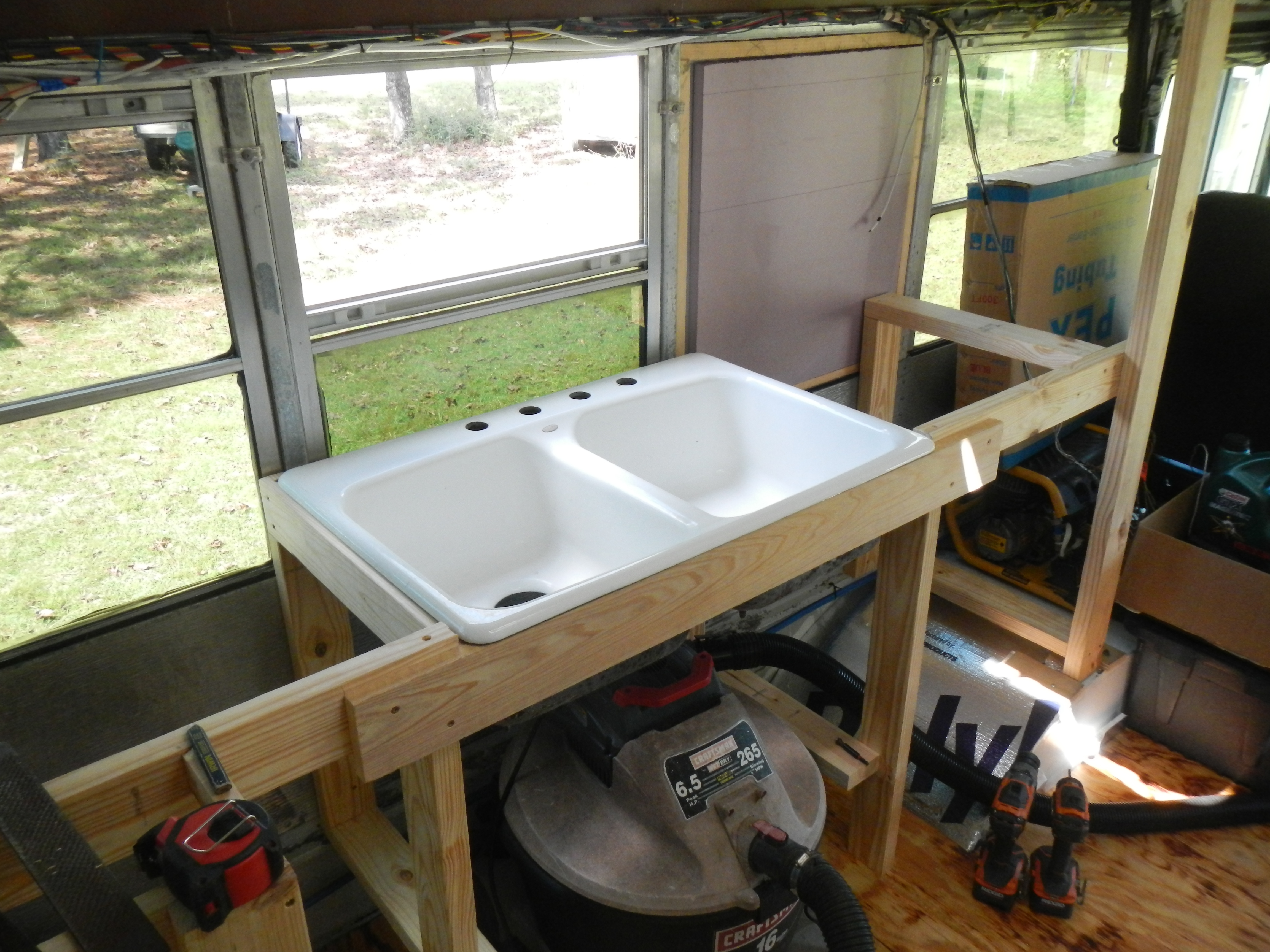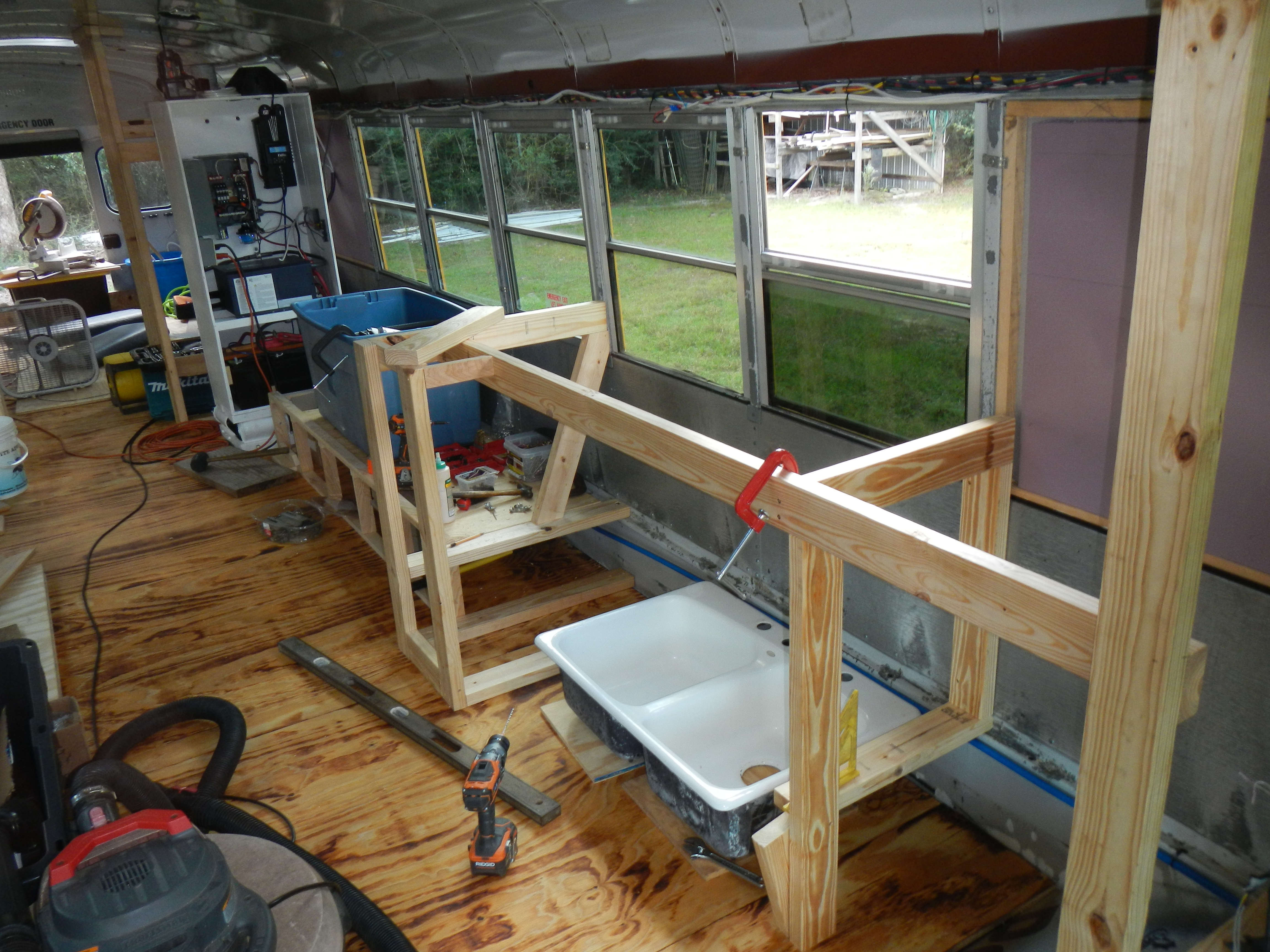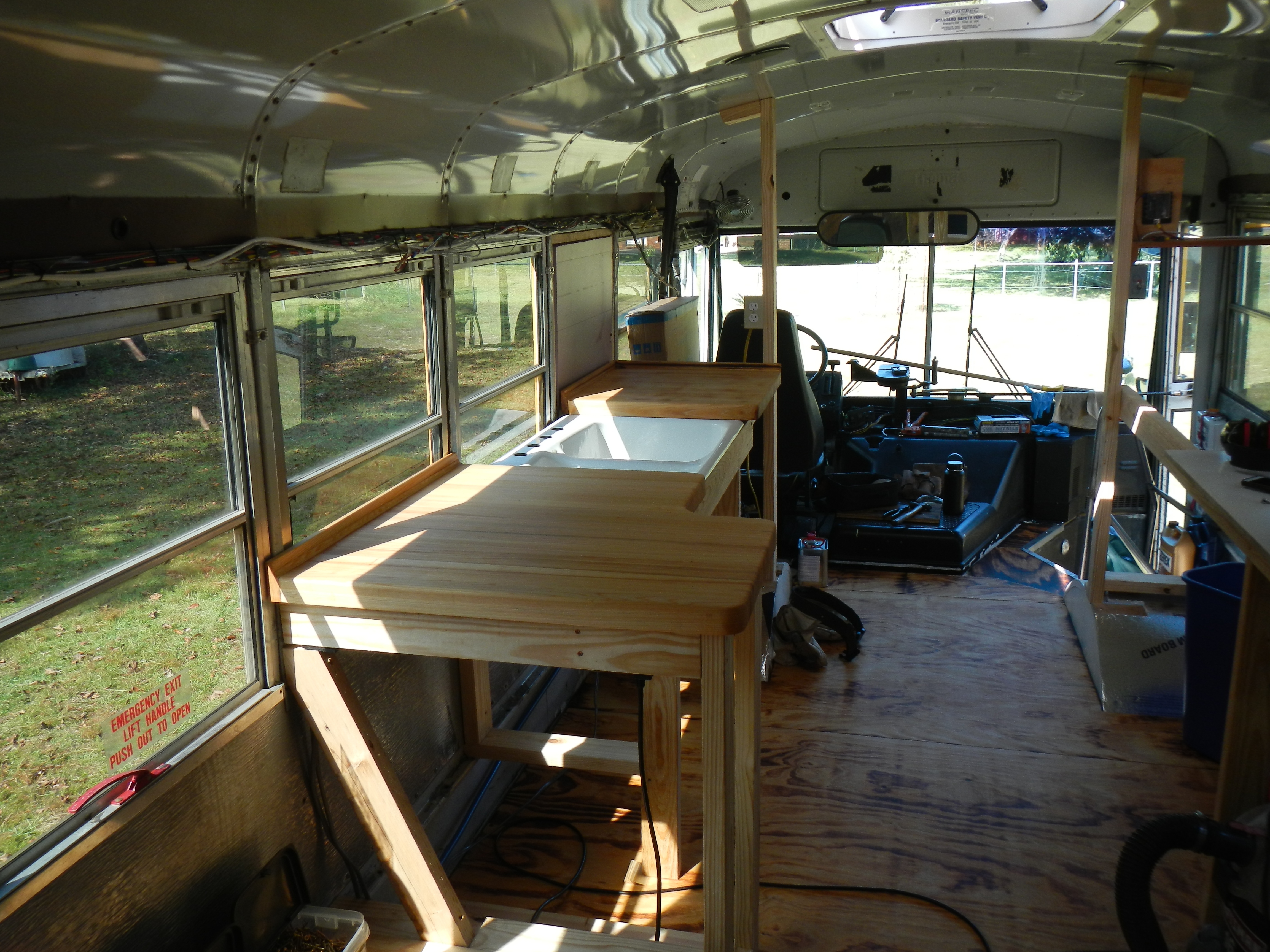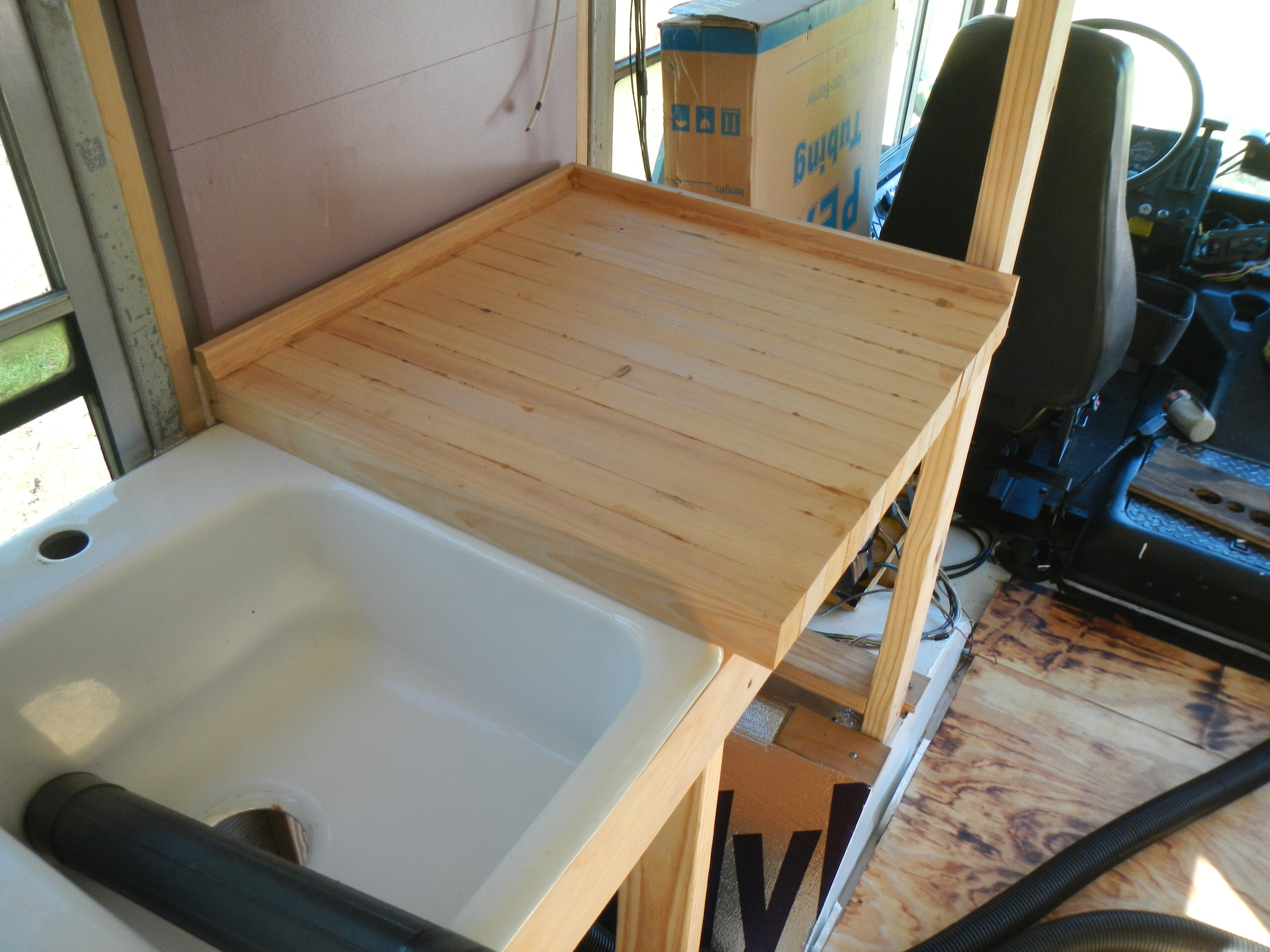 Over the last several weeks, I finished the first set of countertops and framed out counters for both sides of the bus.