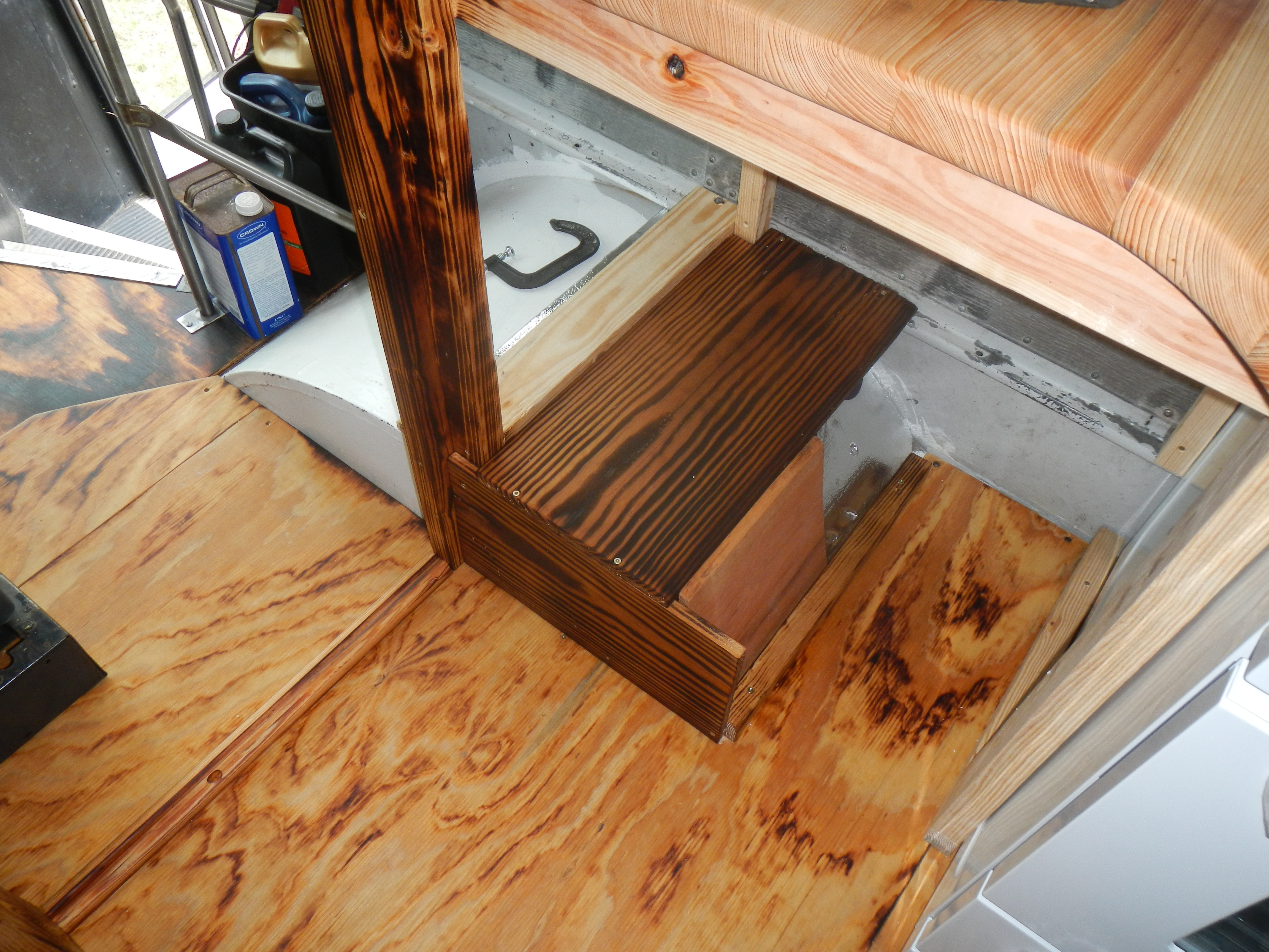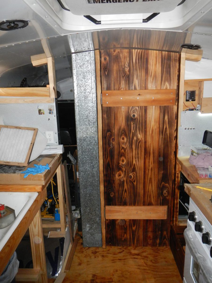 Today I finally finished framing out for and assembling the bulkhead door. Wood used was yellow pine (mostly scraps and salvage, with the exception of one 2x4 stud) and some surplus cypress tongue in groove. Most of the wood had been sitting around in a shed for over a decade, so a bit of restoration was required. This is to say I burned the snot out of it with a blowtorch, gave it a quick pass with the palm sander, and rubbed it down with oil.