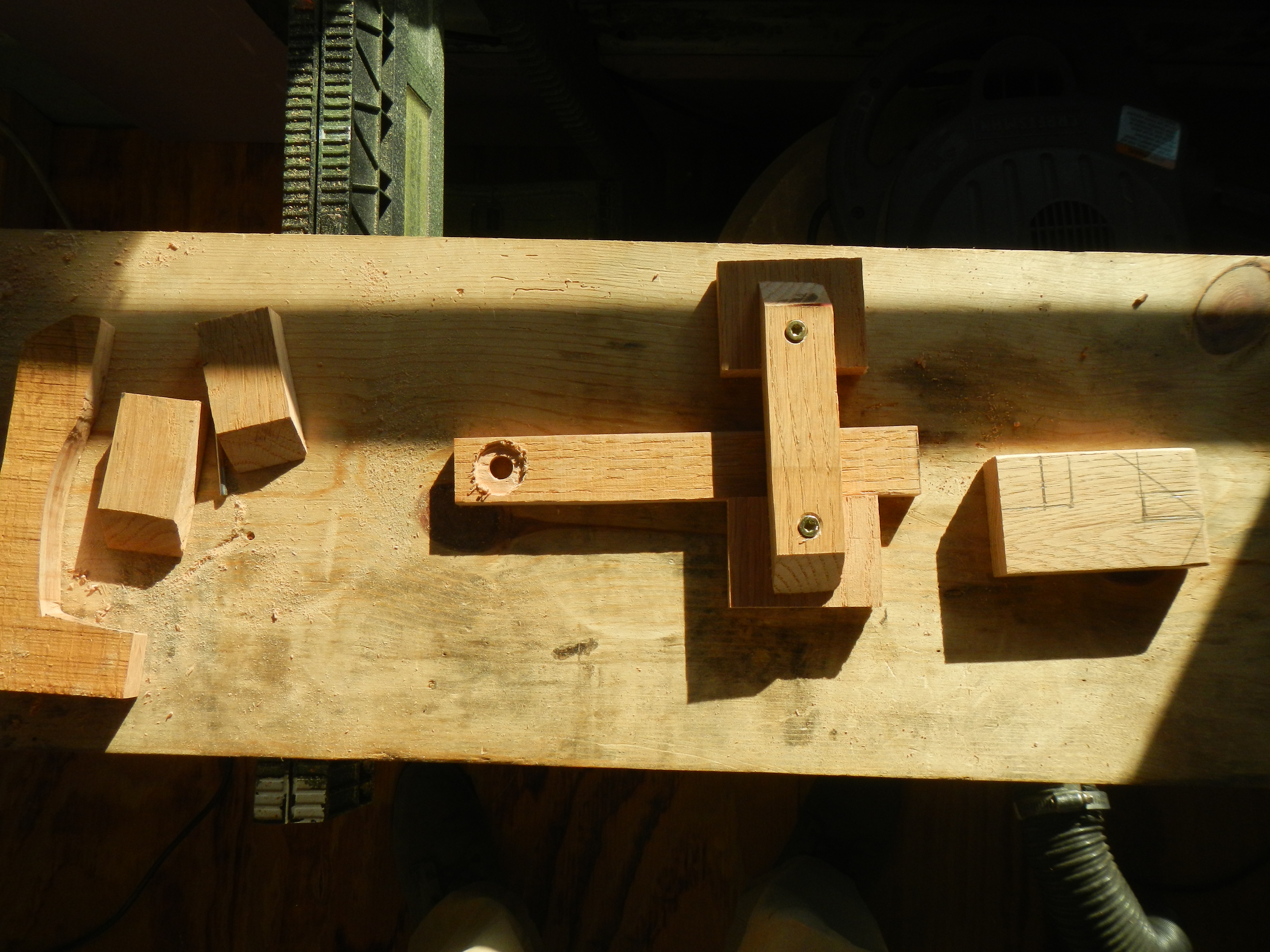 The design I settled on is quite simple- a thin captive bar of wood secured on one end by a bushing and screw, and on the other by a set of blocks and a vertical bar which together permit just enough motion for the bar to ride over the latch.
