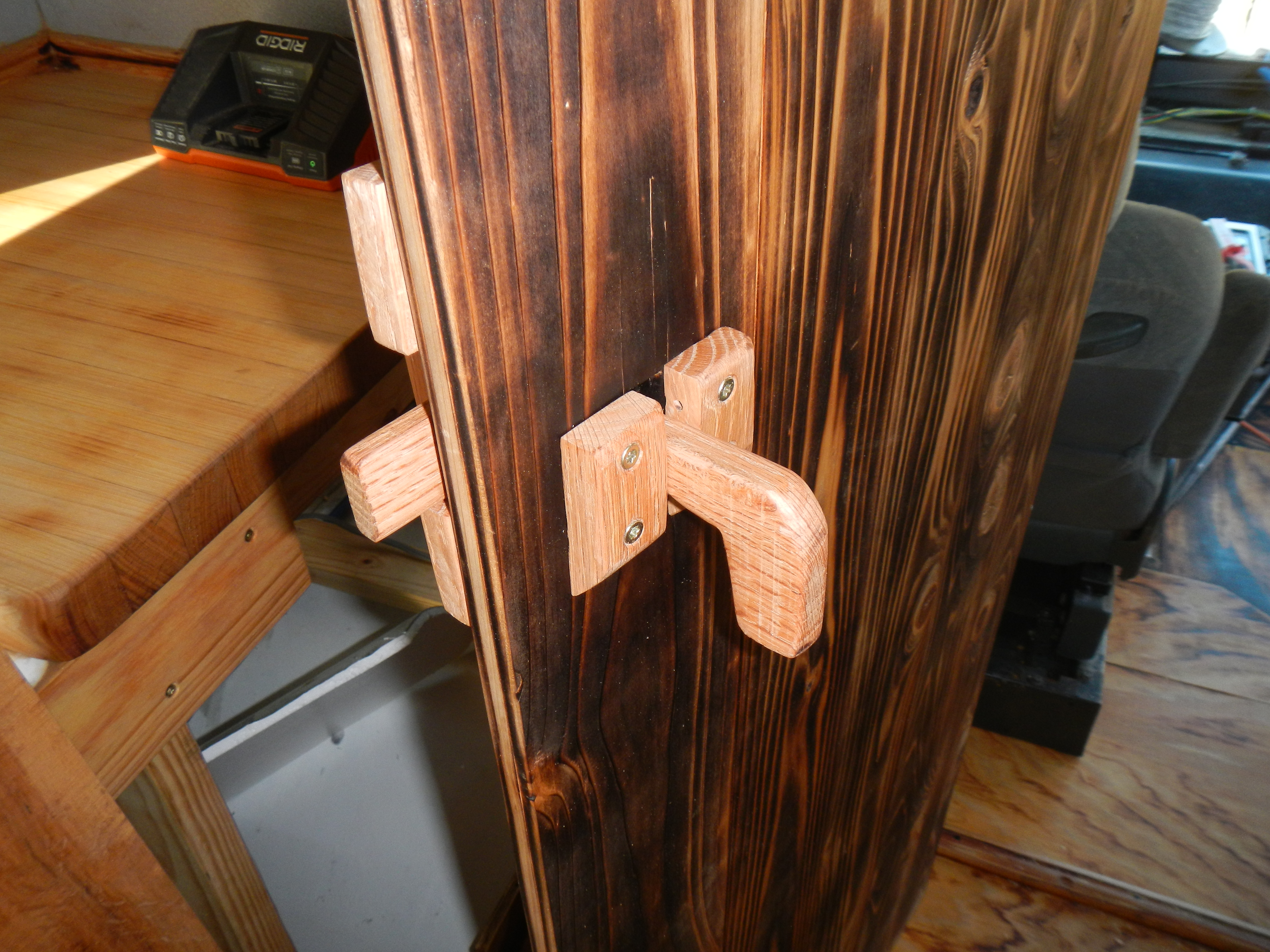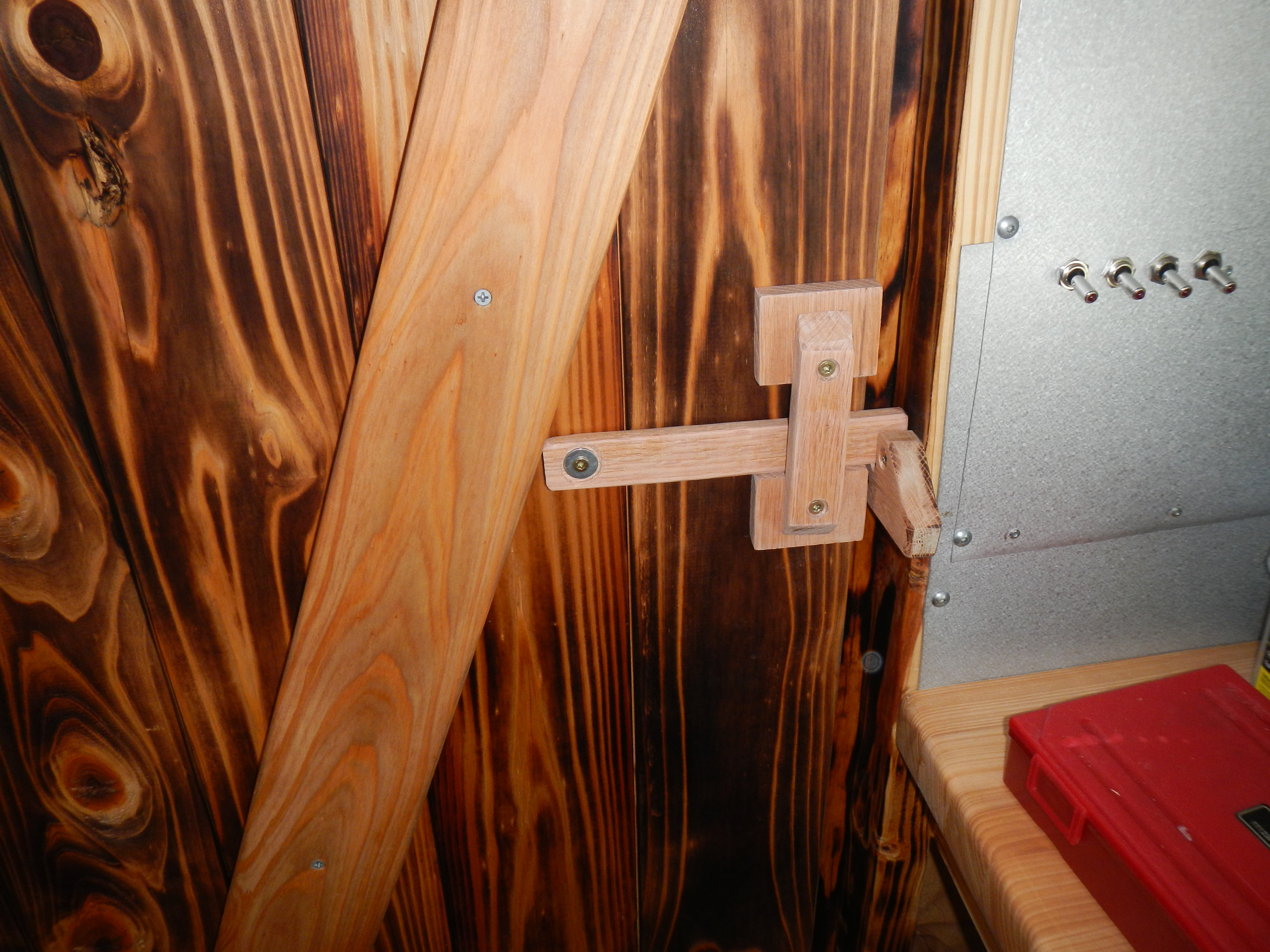 After the door was installed, it spent nearly a week without any sort of latch, as I pondered the available options while working on other stuff. A traditional door knob wasn’t going to work, and a gate latch I picked up from the hardware store was both hideous looking and only marginally functional. Eventually I decided it was worth the time investment to make my own latch using red oak.
