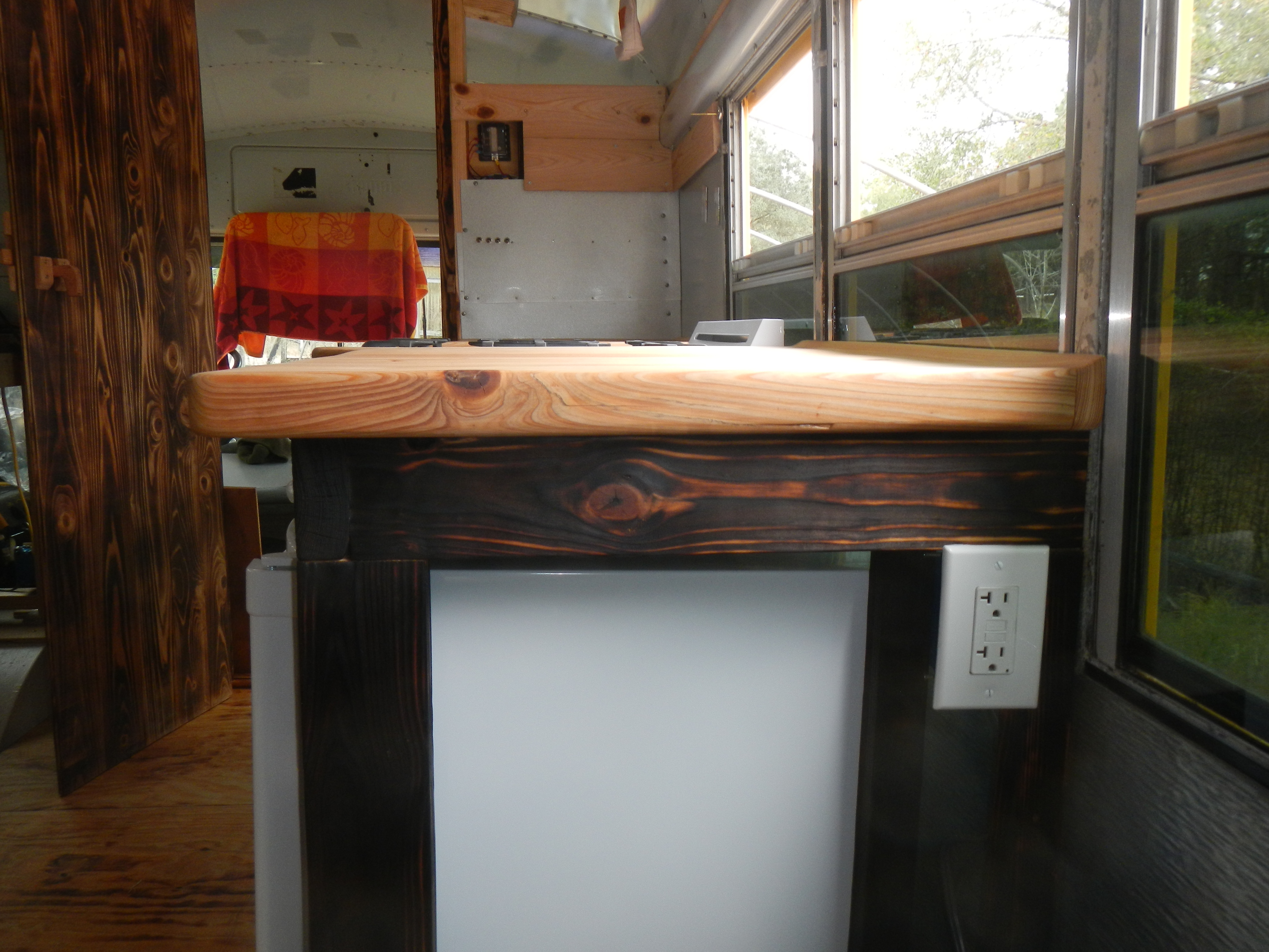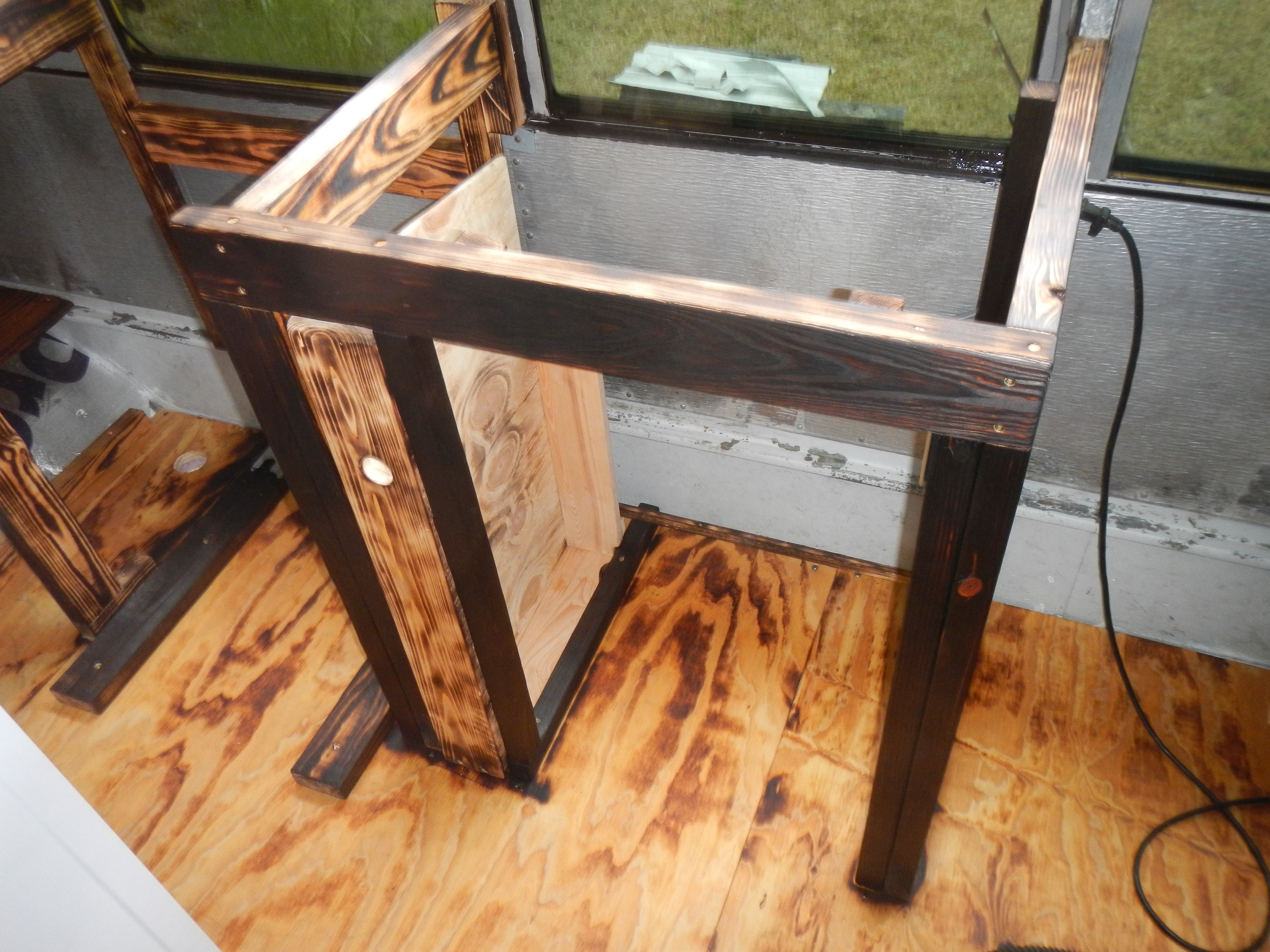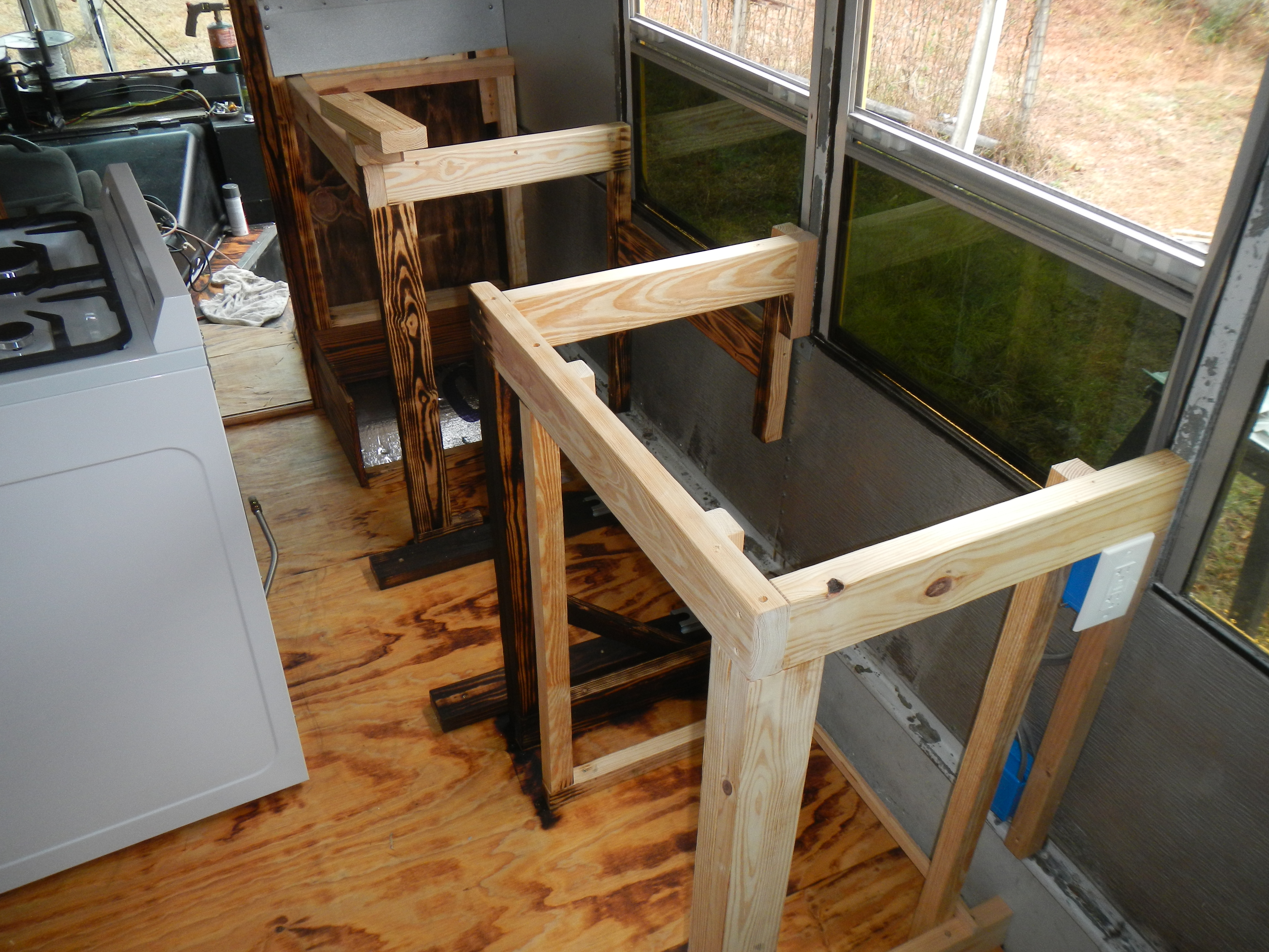 The next day or the day after I finally got around to finishing the counter frames. Read: burning them. I was still a little concerned about residual mildew from a leak which went unattended while I was over in England for Christmas. I’d previously burned a small section of the frame which had gotten mildewed and was satisfied with the treatment (a good burning raises the temperature of the wood well beyond the survival threshold of all but the hardiest mold, mildew and fungi). This time I dedicated an entire day to removing the countertops, pulling out the stove, and partially disassembling the frames. I’m kicking myself for assembling them using glue and screws, as I would have been able to completely take them apart, bring them outside and subject them to 500k BTU had I not gone crazy with the titebond.