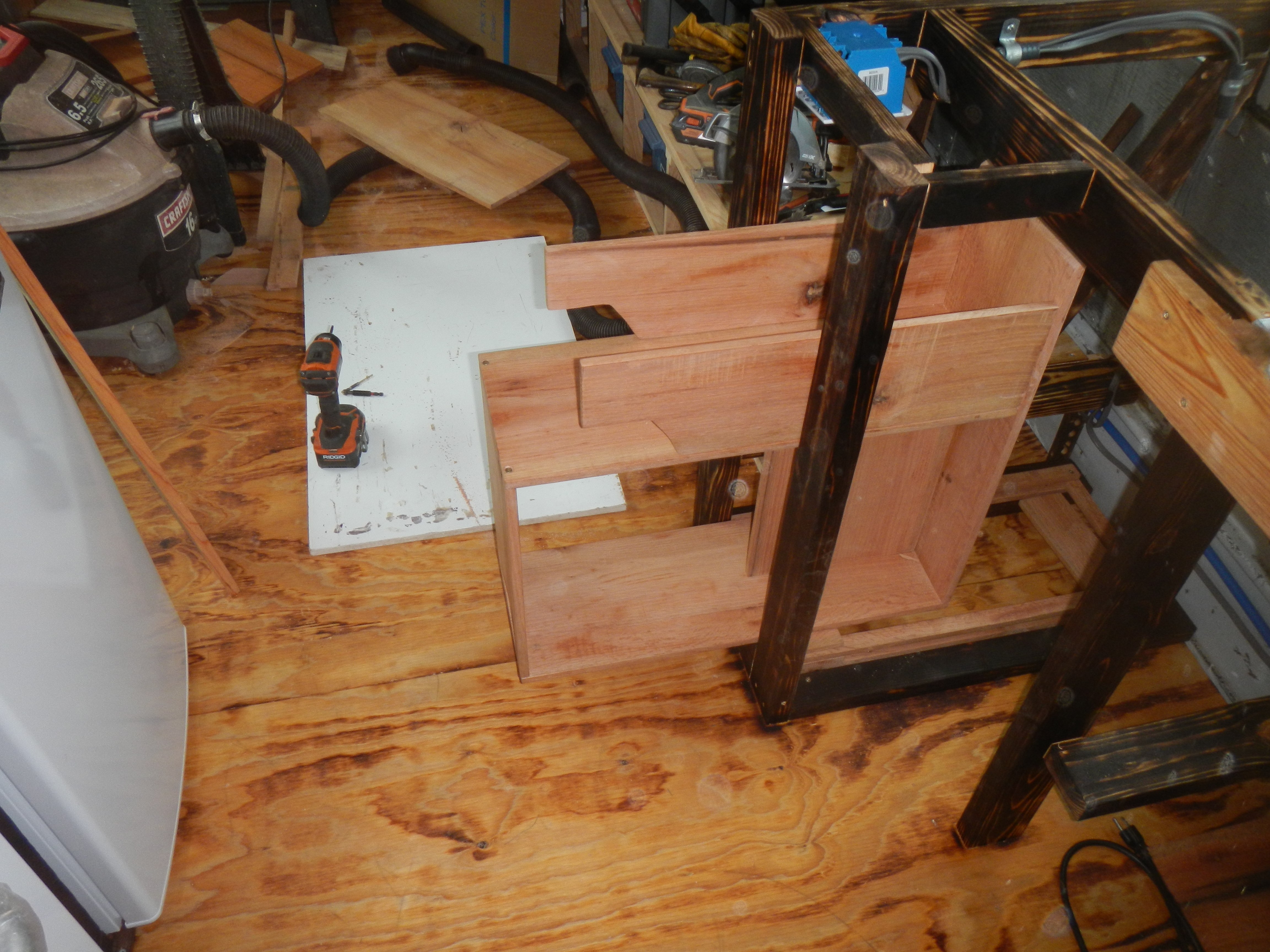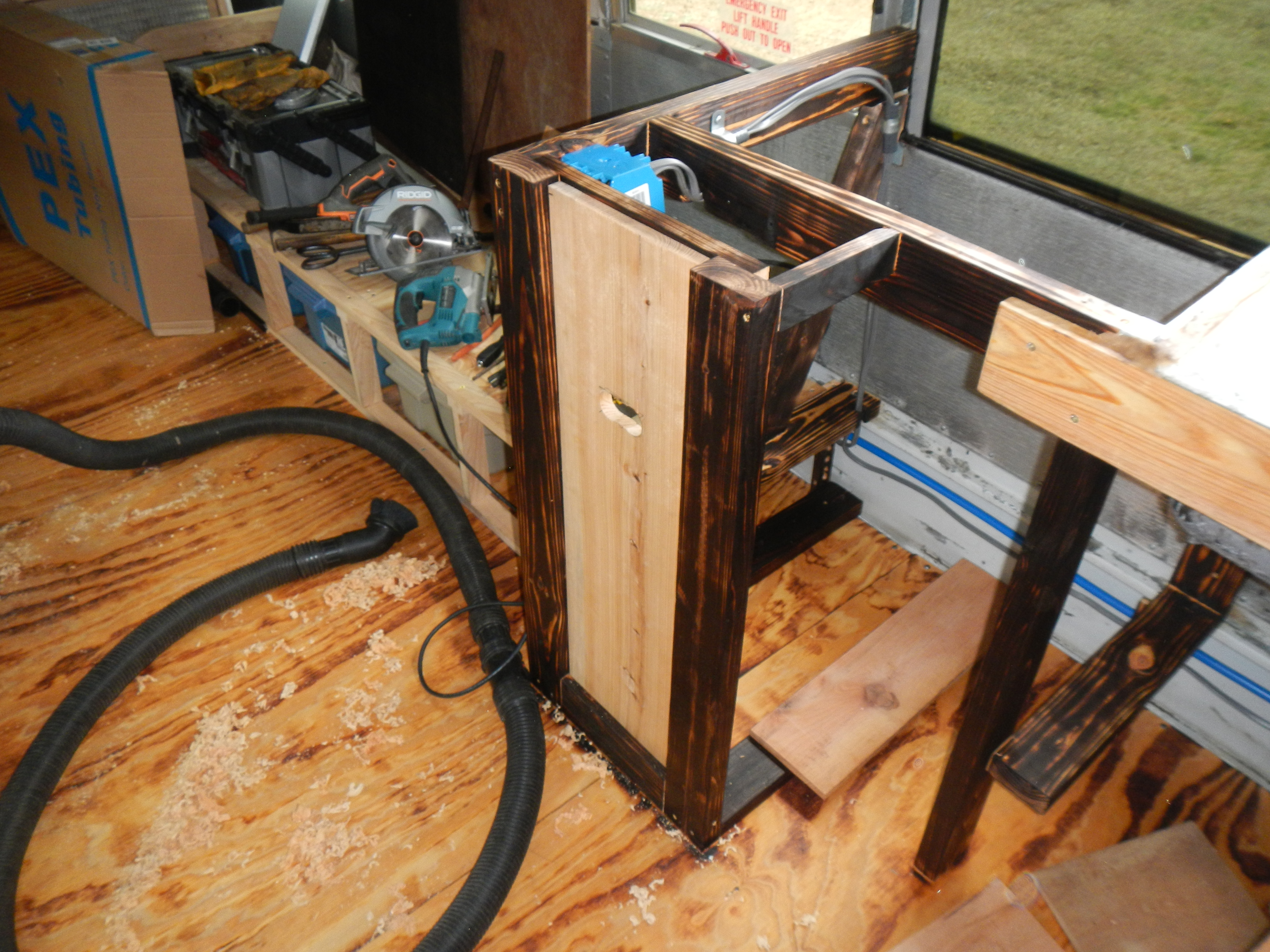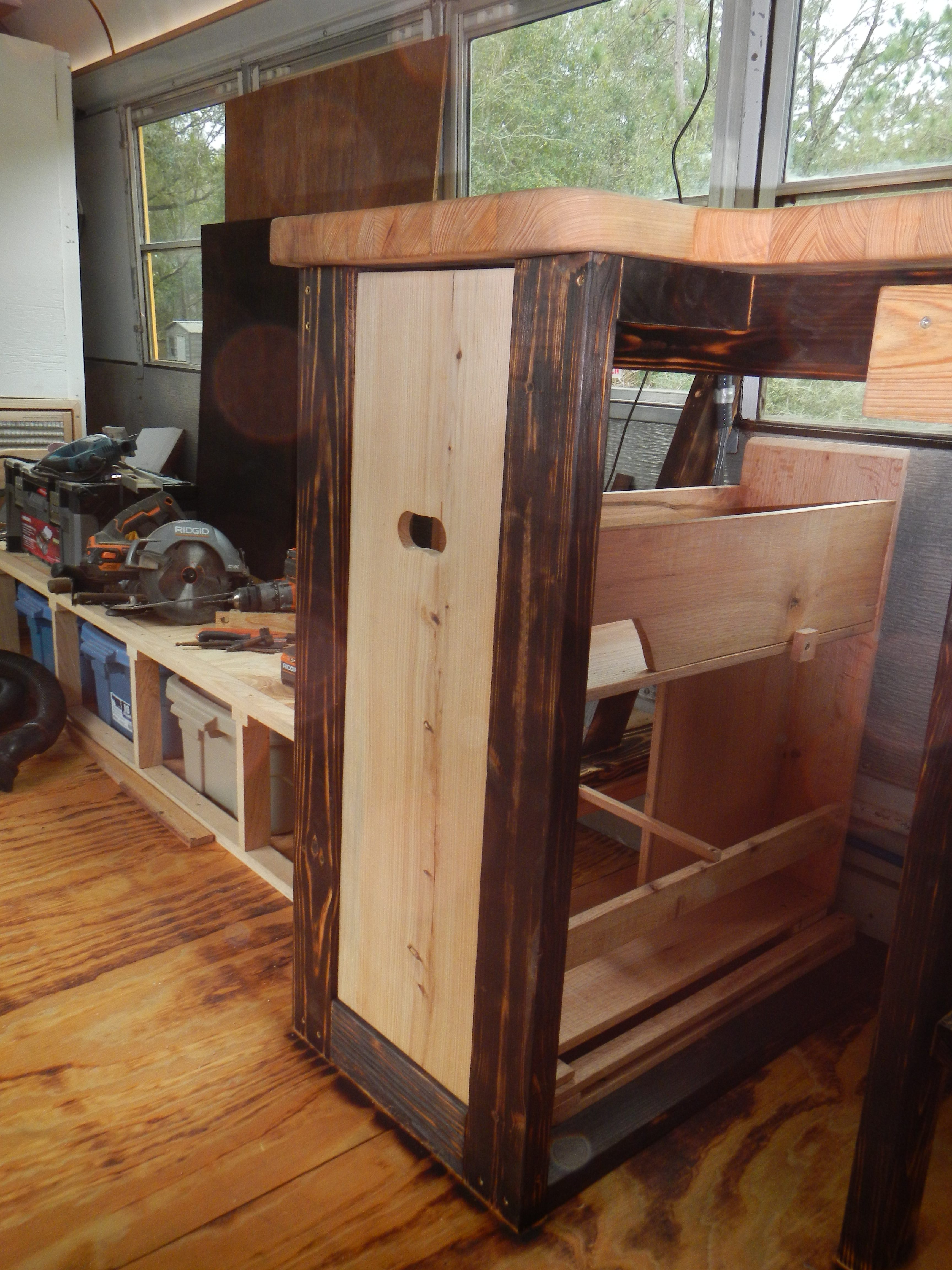 Drawer operation is pretty smooth, even with a heavy load- I promptly filled it up with all my hammers, chisels, a hand plane, pipe wrenches, crescent wrenches and sundry other detritus which had previously lived on the countertops or the bench. I’d originally planned to put some form of paneling up on the counter frames after the drawer was installed, but the burned wood is so pretty that I am now loath to do so. Final decision for finishing trim is pending Hannah’s arrival so she can weigh in after she sees it in person.